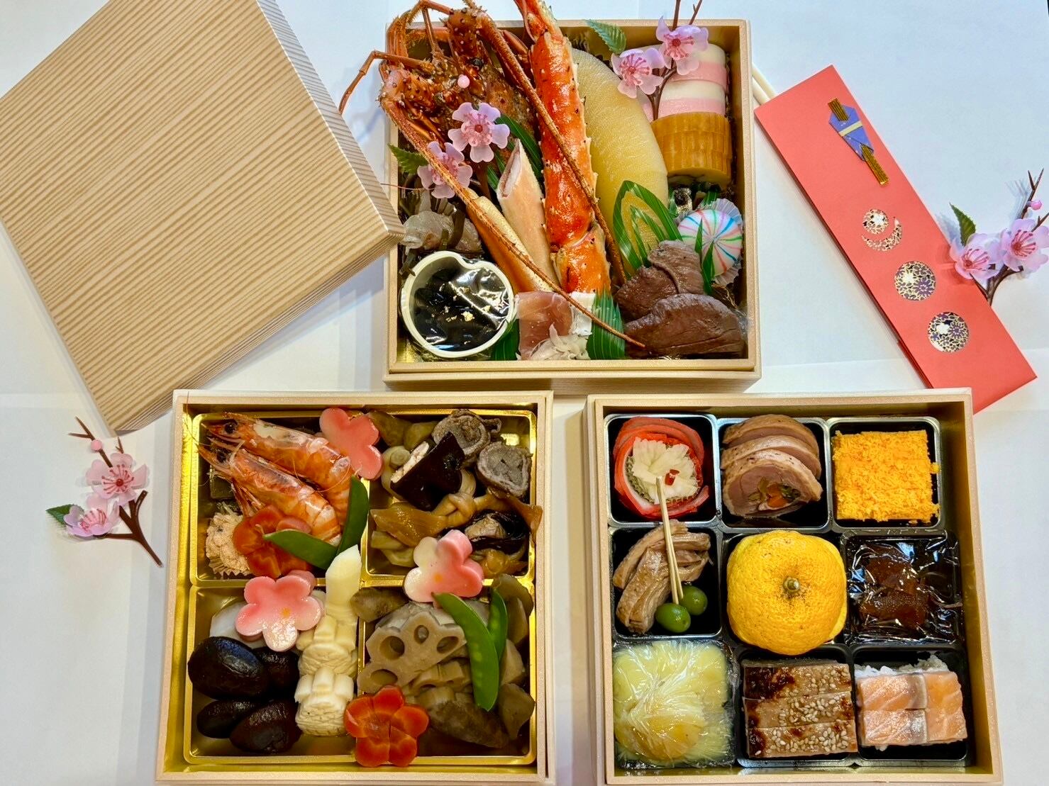 活伊勢海老コキール・伊達巻・数の子・紅白かまぼこ・鰆西京焼・おたふく豆・菊花蕪・活つぶ貝磯煮・ゆり根蜜煮・のし梅奉書・ズワイガニ旨煮・鏡餅・手鞠麩・寿手綱巻・寿錦玉子・スモークサーモン・鳴門金時芋栗きんとん・服部流松風・合鴨スモーク・鴨ロール・金粉黒豆・活車海老つや煮・サーモン昆布巻・新筍・国産くわい・八つ頭旨煮・蓮根・ごぼう・こんにゃく照煮・京人参・しいたけ旨煮・梅麩・近江牛八幡巻・絹さや・子持ち鮎甘露煮