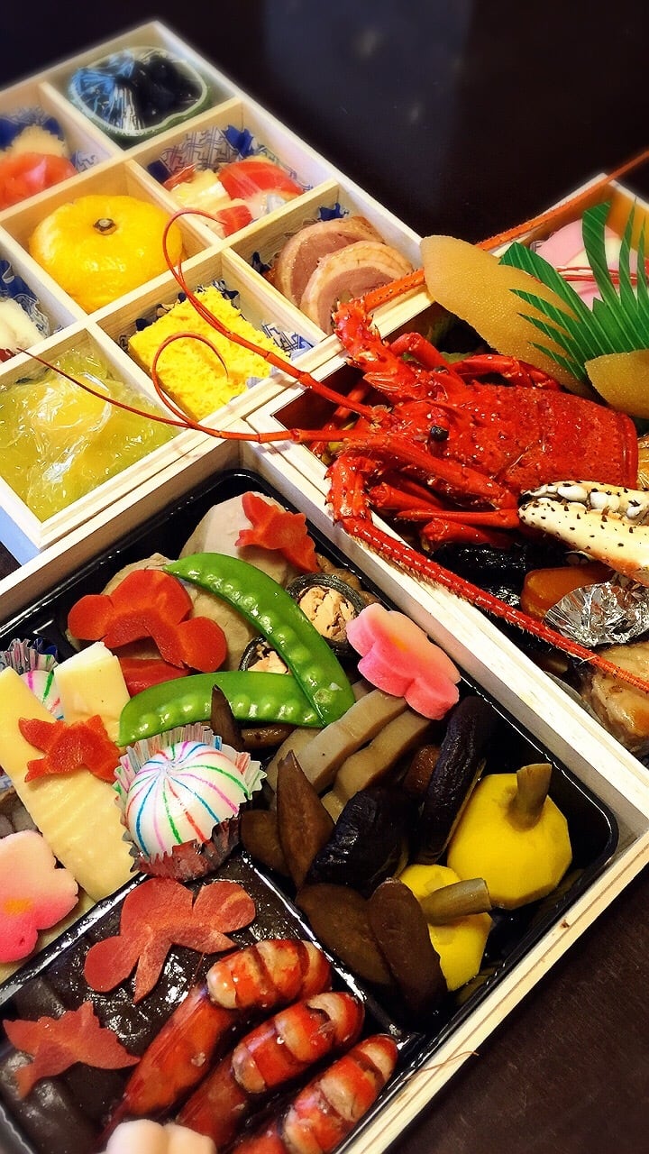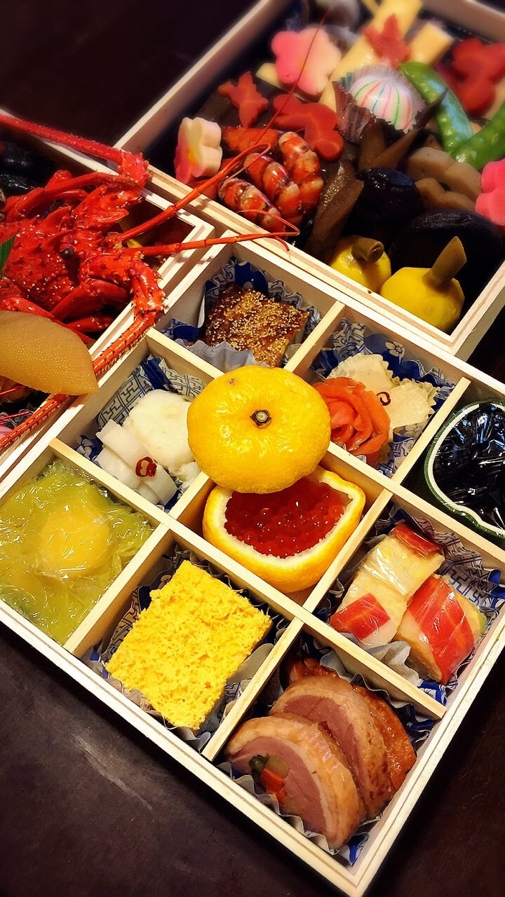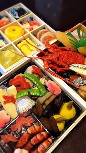 活伊勢海老コキール・伊達巻・数の子・紅白かまぼこ・鰆西京焼・おたふく豆・菊花蕪・活つぶ貝磯煮・ゆり根蜜煮・のし梅奉書・ズワイガニ旨煮・鏡餅・手鞠麩・寿手綱巻・寿錦玉子・スモークサーモン・鳴門金時芋栗きんとん・服部流松風・合鴨スモーク・鴨ロール・金粉黒豆・活車海老つや煮・サーモン昆布巻・新筍・国産くわい・八つ頭旨煮・蓮根・ごぼう・こんにゃく照煮・京人参・しいたけ旨煮・梅麩・近江牛八幡巻・絹さや・子持ち鮎甘露煮